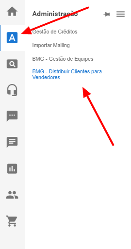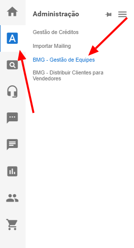A distribuição de clientes para equipes é realizado no menu ADMINISTRAÇÃO > BMG – GESTÃO DE EQUIPE