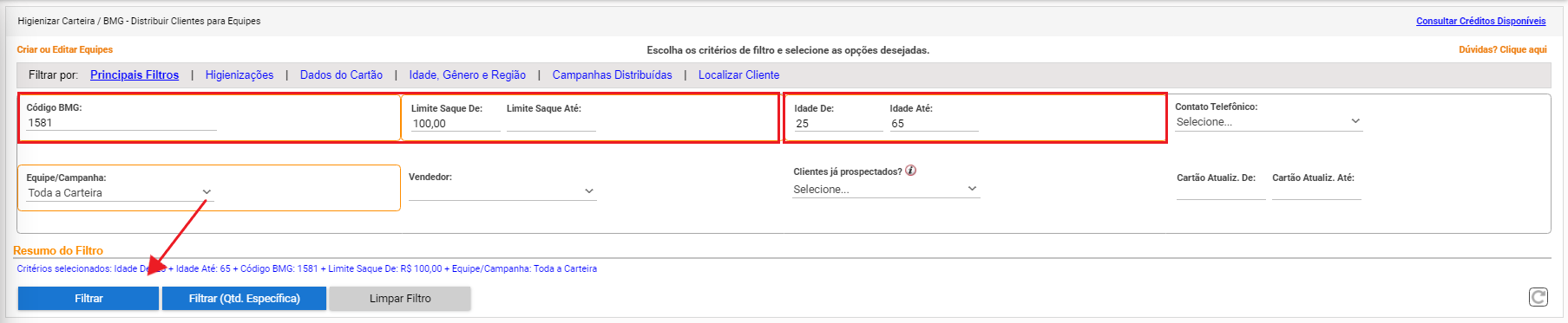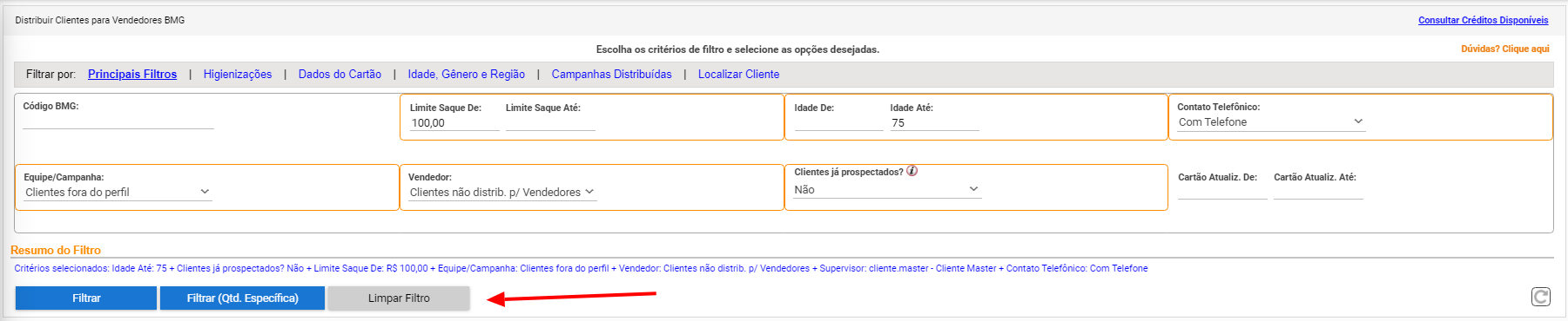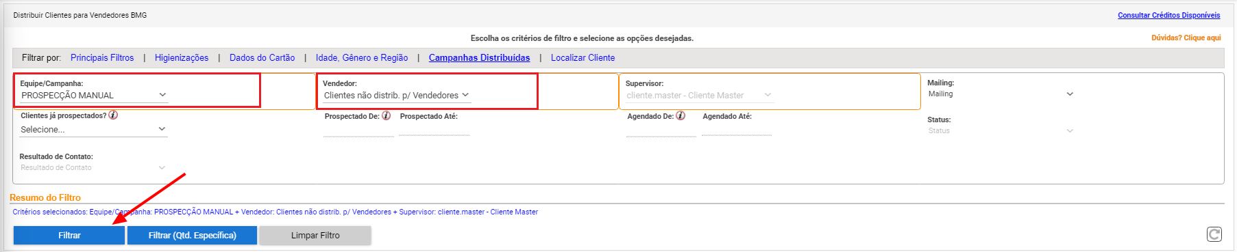 Na tela de distribuição, informe o perfil dos clientes que deseja distribuir através dos filtros, conforme já explicando.
