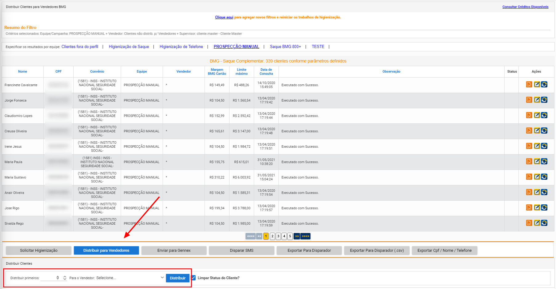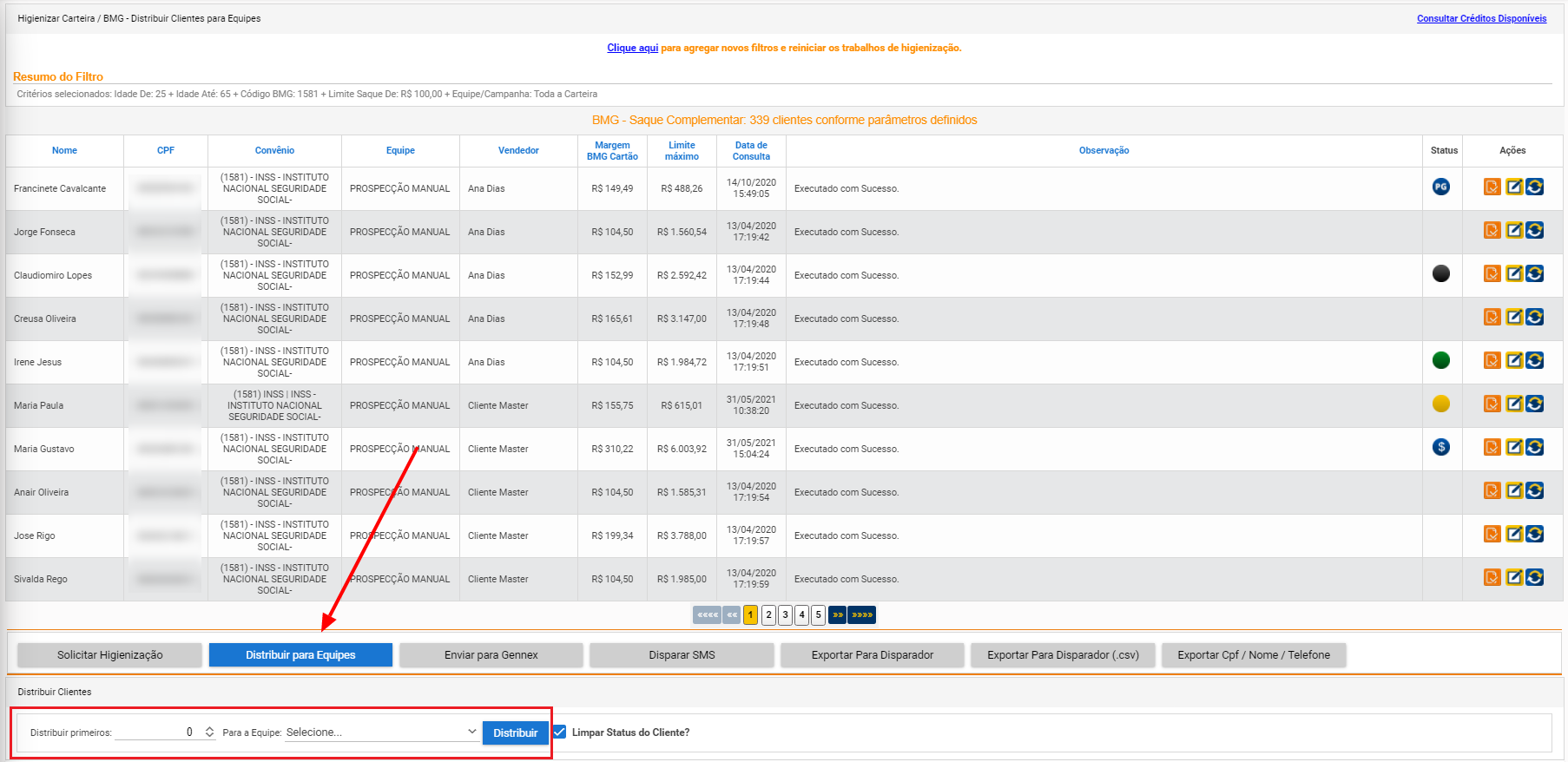 Realizado a filtragem dos clientes a distribuição é feita clicando em DISTRIBUIR PARA VENDEDOR.