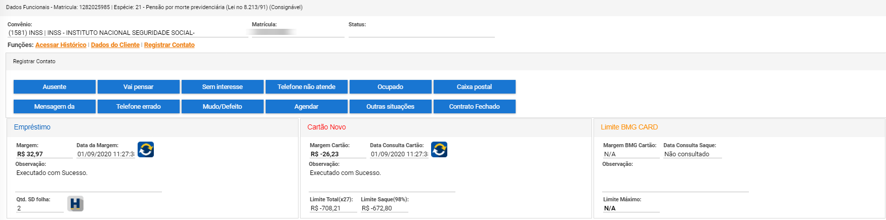 Além disso, você tem acesso as funções como ACESSAR HISTÓRICO, DADOS DO CLIENTE E REGISTRAR CONTATO, que exibirão informações específicas sobre este cliente.